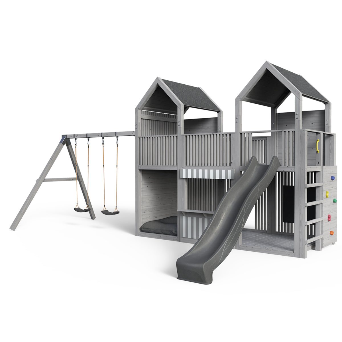 Vores legetårne i lærketræ "Alex", "Anton" og "Mia" garanterer klatresjov, hurtige rutsjebaner og sikker gyngning .