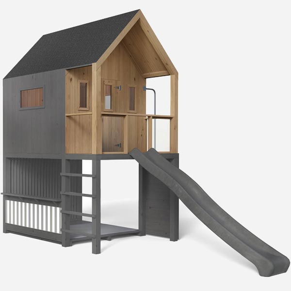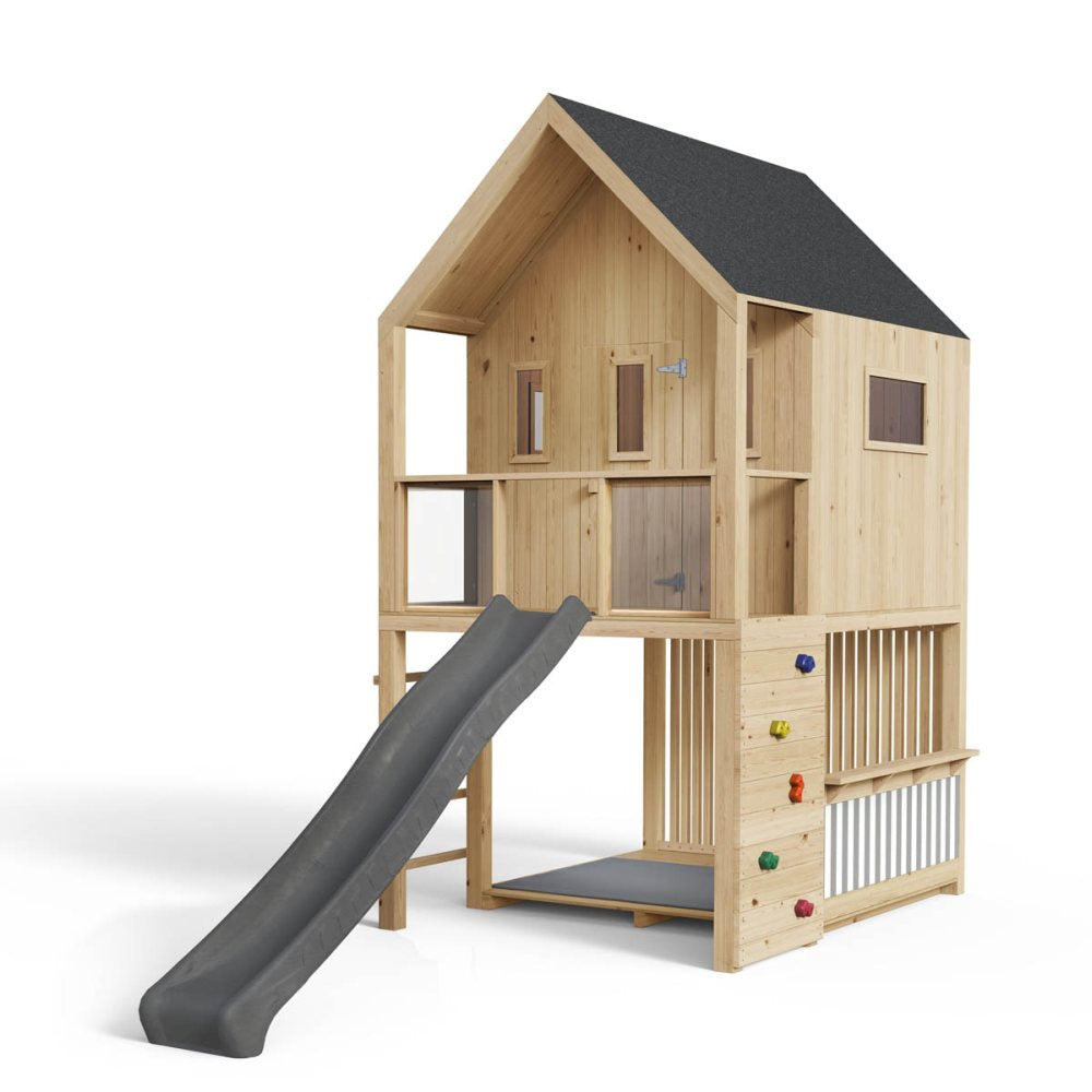 ✔️ Lige design - 1,50m platformshøjde ✔️ Shop med gråt presenningsstof ✔️ 3m lang grå bølgerutschebane ✔️ Stabilitet takket være 9x9 cm stylter ✔️ Rumhøjde på 2,10 m ✔️ inklusive jordanker