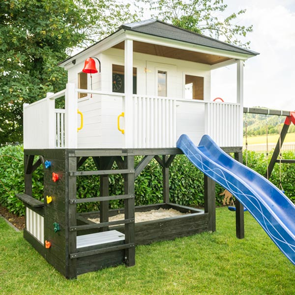 Takket være klatrevæggen med farverige klatresten er pælehuset også et klatretårn, hvor små opdagelsesrejsende kan lære nye bevægelser. Selv mindre børn kan nå vores pælehuse via trapper eller klatrestige. Efter at have erobret pælehuset med balkon, kan børnene hurtigt gå ned ad rutsjebanen igen for at bygge sandslotte i sandkassen eller "chill out" i børneloungen. Der er plads til at to børn kan gynge samtidigt på den robuste gynge . Et pælehus kan hurtigt blive en hel legeplads.