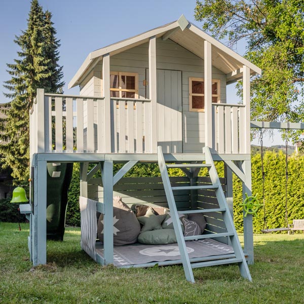 Takket være klatrevæggen med farverige klatresten er pælehuset også et klatretårn, hvor små opdagelsesrejsende kan lære nye bevægelser. Selv mindre børn kan nå vores pælehuse via trapper eller klatrestige . Efter at have erobret pælehuset med balkon, kan børnene hurtigt gå ned ad rutschebanen igen for at bygge sandslotte i sandkassen eller for at "chill out" i børneloungen. Der er plads til at to børn kan gynge samtidigt på den robuste gynge . Et pælehus kan hurtigt blive en hel legeplads.