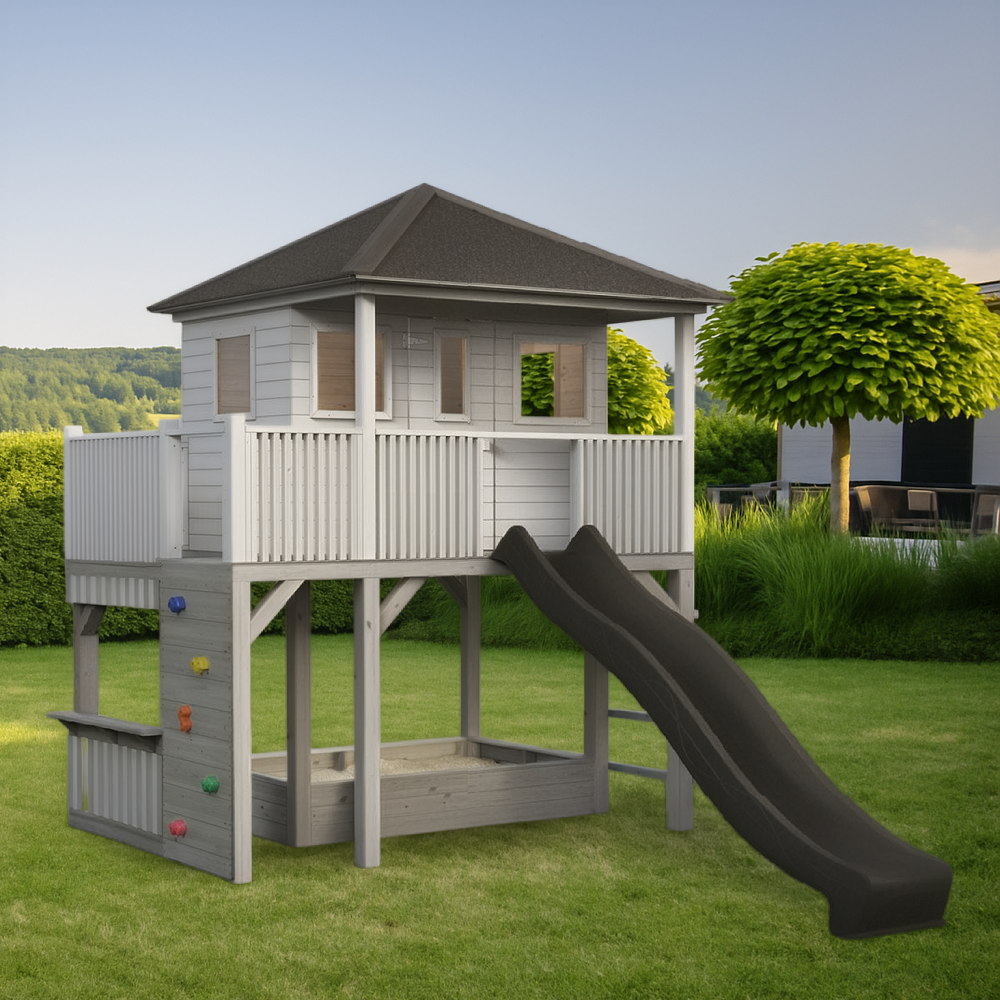 med sandkasse, klatrevæg, sideveranda, butik, legetøjskasse og rutsjebane
