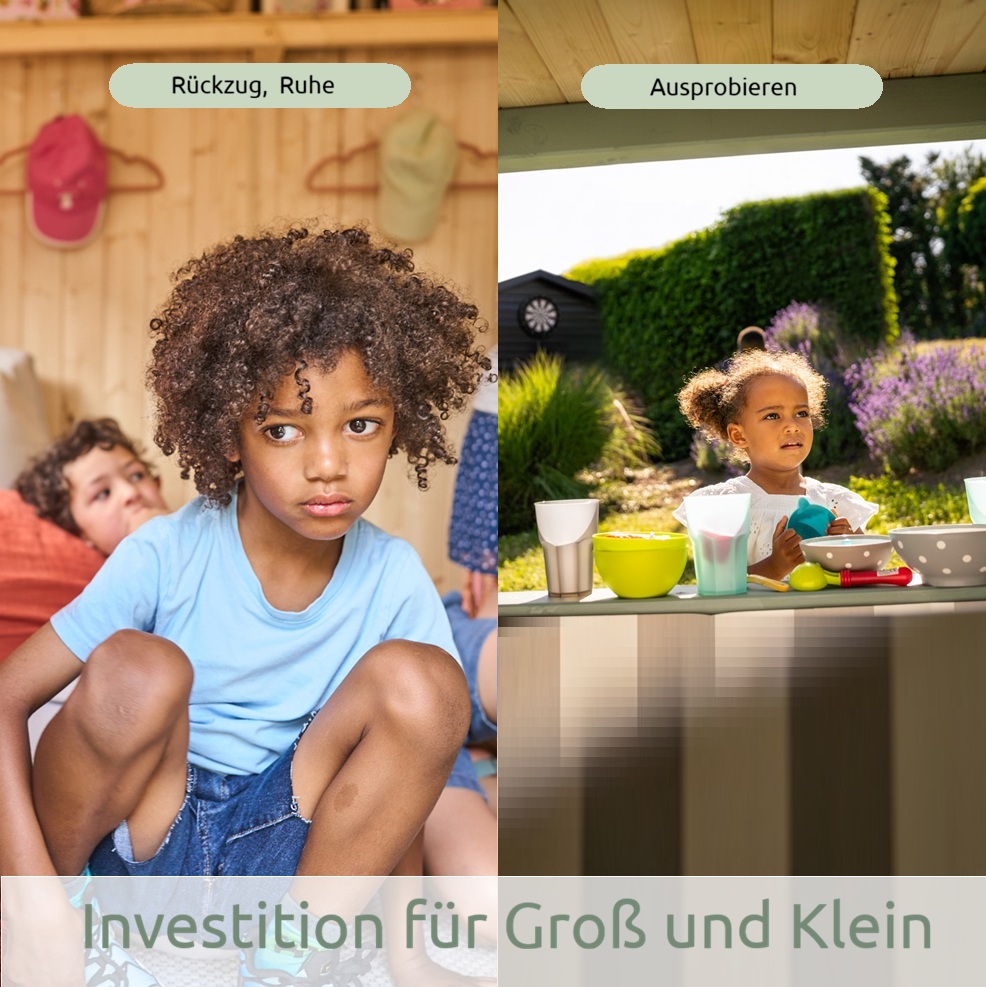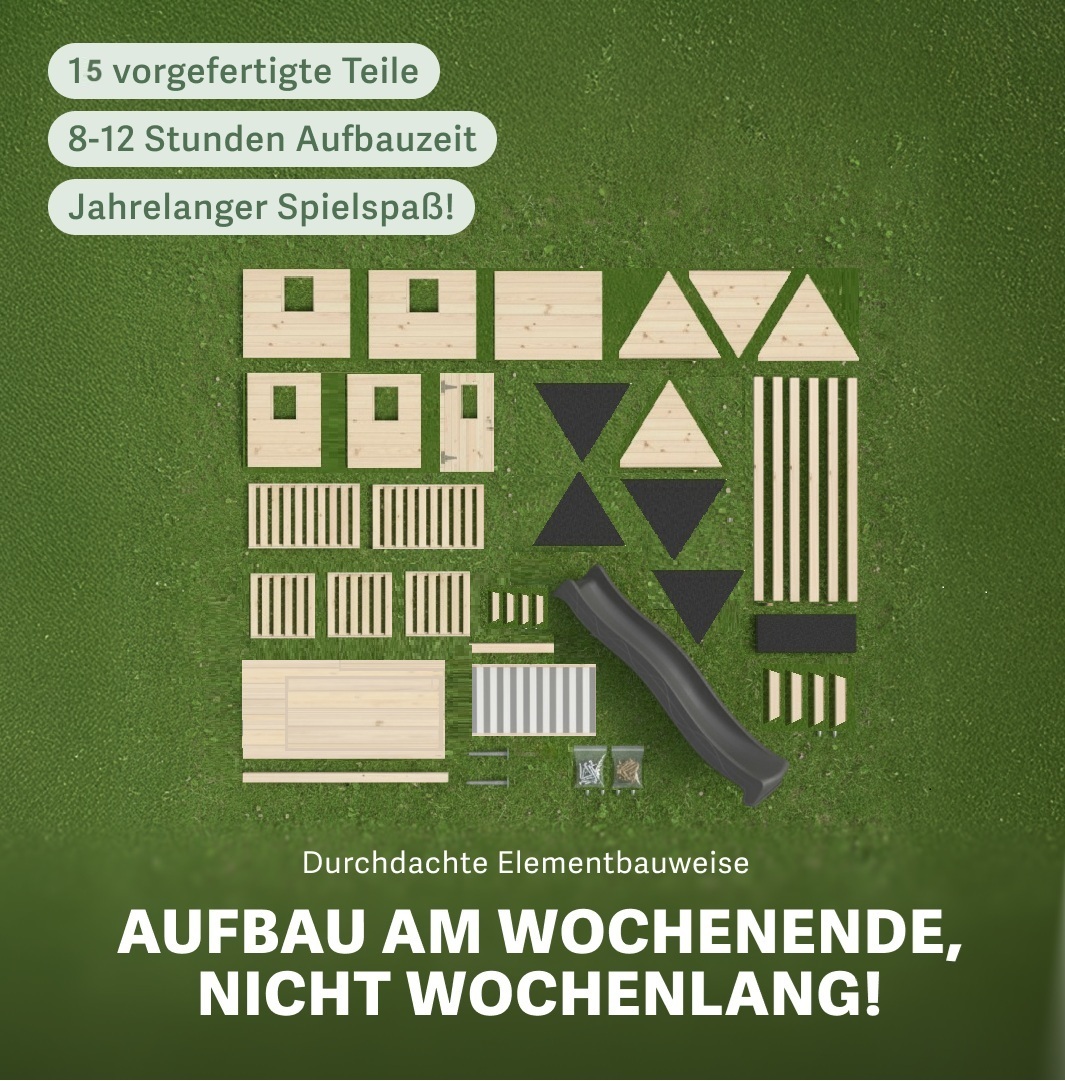 Et stærkt hus: Udviklet i Tyskland efter EN-1176 + + naturligt massivt træ + stabil konstruktion + simpelt design + høj spilleværdi + nem montering takket være præfabrikerede komponenter + meget gode råd + sikker transport + passende jordankre + bæredygtig træbeskyttelse + nem vedligeholdelse.