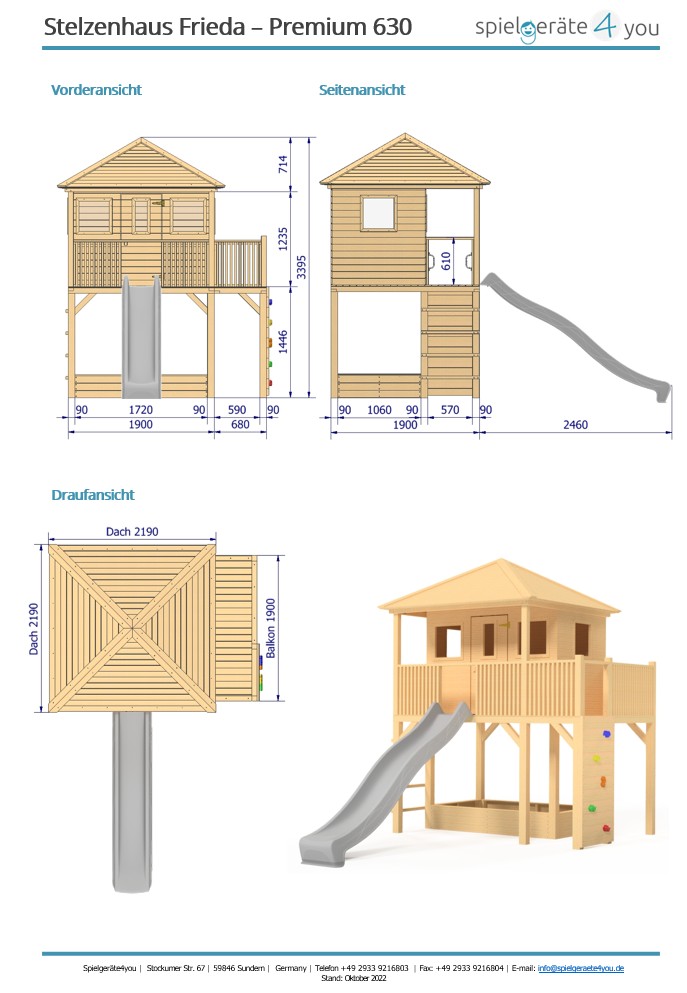 Vores nye udvikling - Stilt House Frieda - er skræddersyet til den nuværende boligtrend i mange nye boligbyggerier. Den slående tagform er enkel og subtil. Den har en fantastisk symmetri af geometriske former og er den perfekte form til et legehus. Legehuset inklusiv verandaen er kvadratisk (1,90m x 1,90m) med tilhørende altan i siden, som udvider legeområdet med yderligere 2 kvadratmeter. Sidevæggene er 1,30 m og den samlede højde, op til toppen, er næsten 2 meter. Det betyder, at selv større børn har et sted at trække sig tilbage til. Børnene har masser af plads til at lege. Platformhøjden på 1,50 m og kraftigt træ sikrer stabilitet og store udfordringer, ikke kun for de mindste. En stige med trin og en klatrevæg med farvede klatresten sikrer sikker opstigning. Butikken inviterer til rolleleg, og legetøjskassen giver plads til oprydning. Rækværket med 28 x 48 mm tykt træ giver et særligt look. Designet minder meget om facadetræet, der bruges i mange moderne bygninger. Alt i alt en fantastisk villa til børnene, der passer til byvillaen.