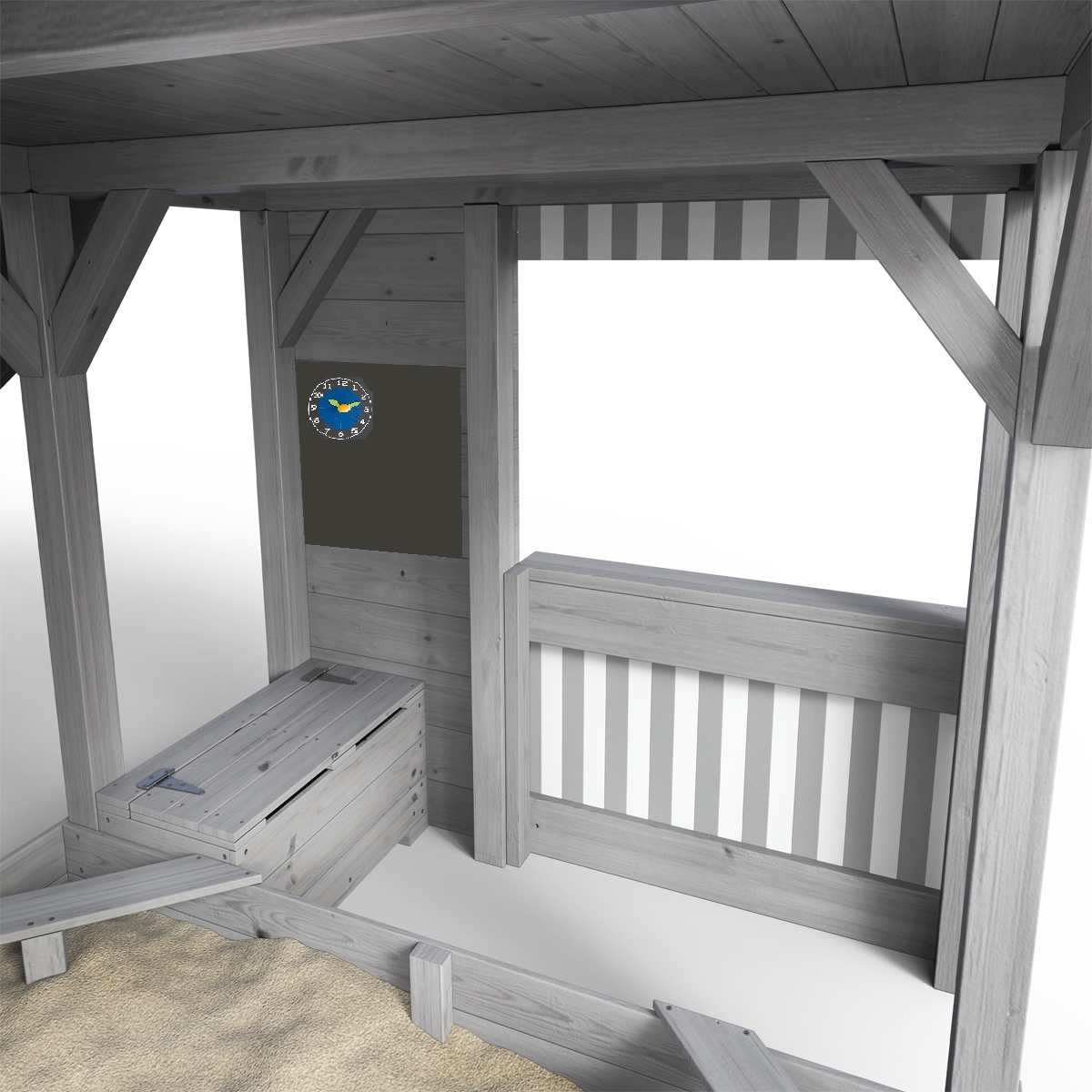 Legerummet har en fantastisk størrelse og højde selv for store børn. Som et ekstra højdepunkt inkluderer udgaven en butik med grå- og hvidstribet markisestof og legetøjskassen med låg.