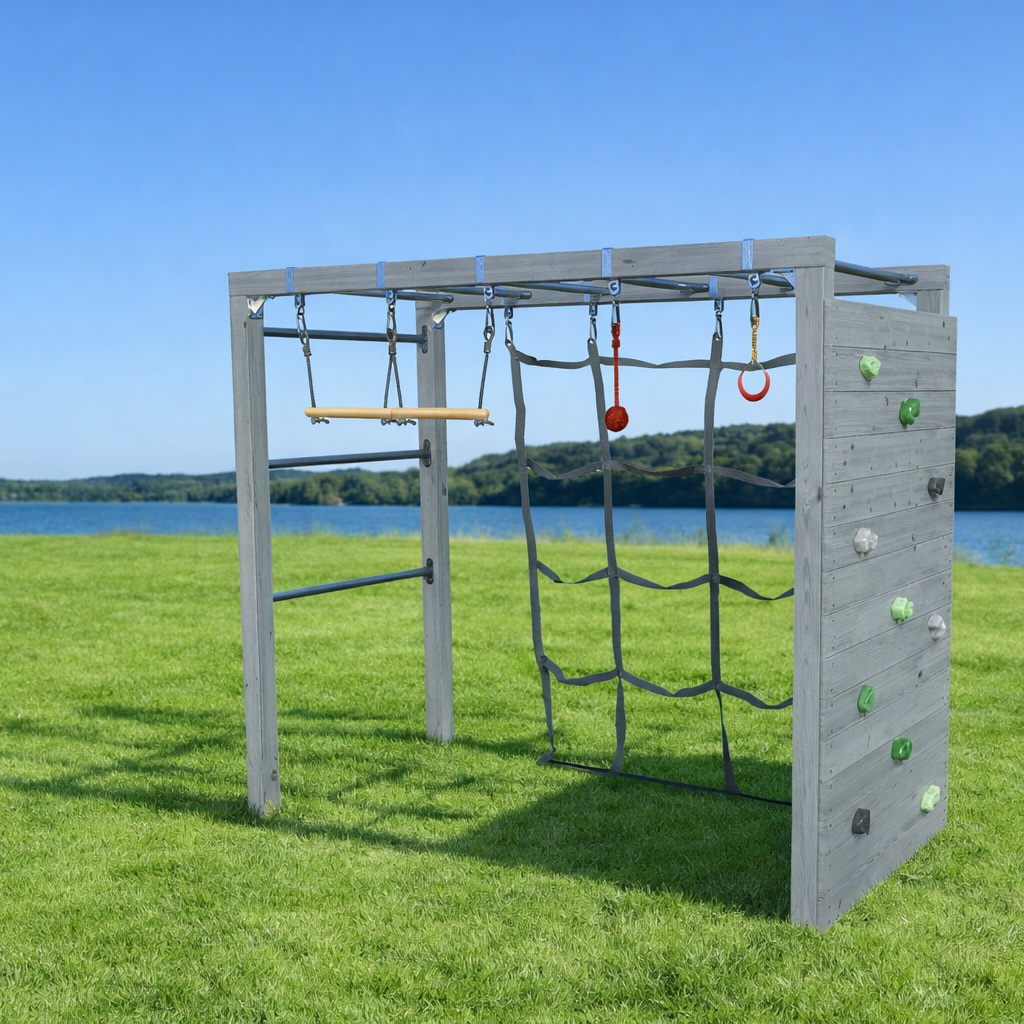 - Die FamilyFit Climb ist Spielplatz, Rig und Fitness-Rack in einem. Kinder nutzen das Turngerüst als Abenteuer- und Kletter-Parcours, während Erwachsene es als Outdoor-Fitness-Hub für Workouts, Reckübungen, Klimmzüge oder Calisthenics-Training einsetzen.