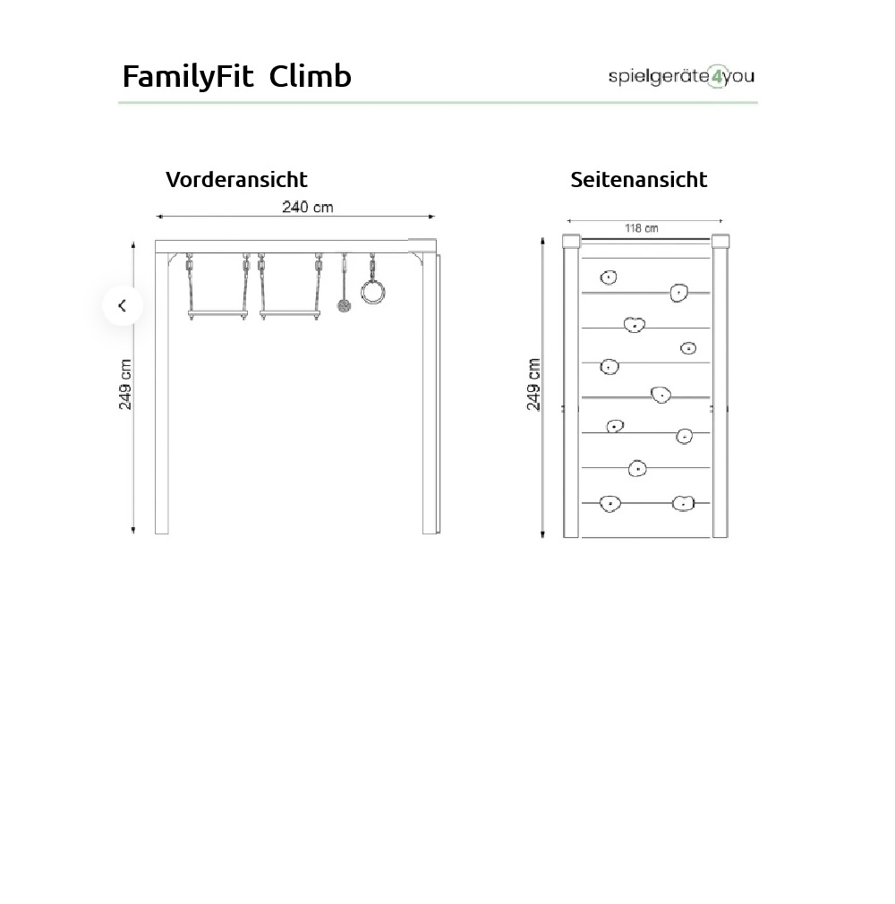 - Die FamilyFit Climb ist die erweiterte Version der FamilyFit Base – ausgestattet mit zusätzlicher Kletterwand, die Kinder und Jugendliche spielerisch an ihre Grenzen bringt. Ob Klettern, Hangeln oder Balancieren: Dieses Outdoor-Klettergerüst kombiniert Spiel, Abenteuer und Fitness in einem.