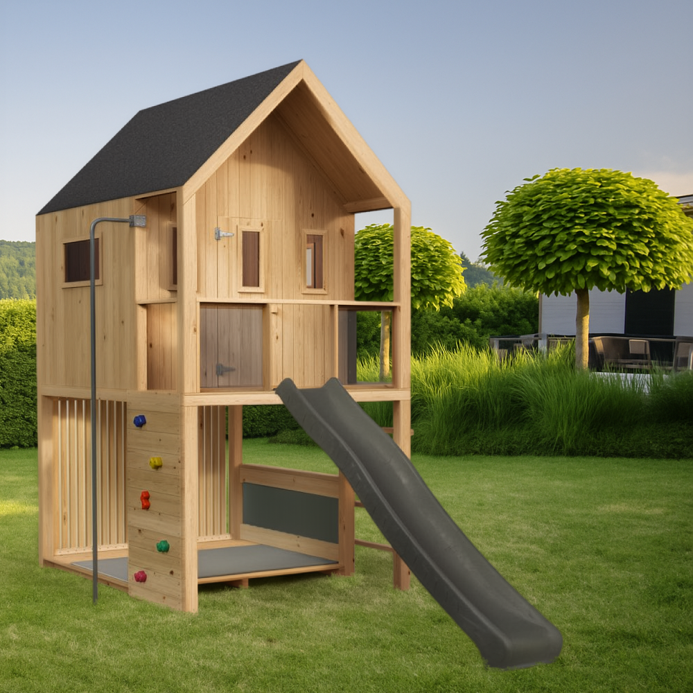 Den stabile konstruktion med robuste 9x9 støttebjælker og 1,6 cm tykke husvægge garanterer sikkerhed og holdbarhed. Det betyder, at pælehuset forbliver stabilt og modstandsdygtigt selv under intensiv brug.