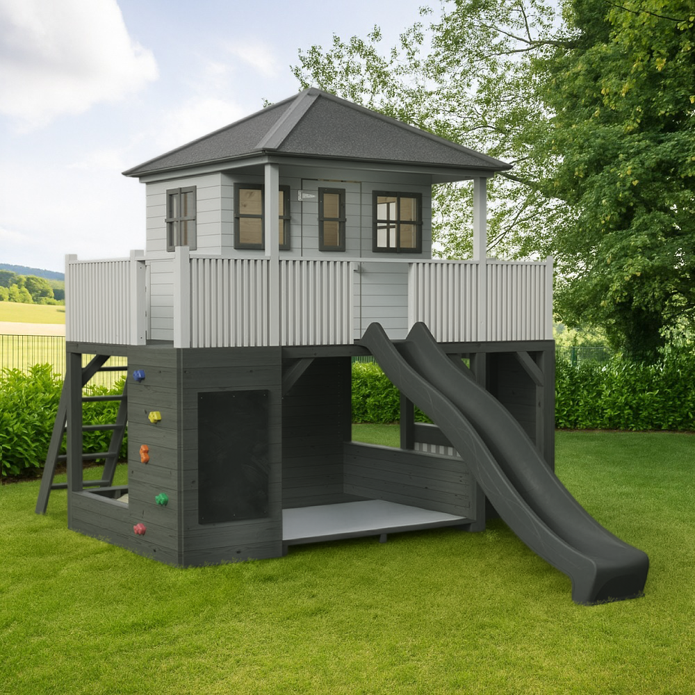 Loft er navnet på noget stort og moderne. Nyt og ligetil - Frieda Loft pælehus - med et attraktivt telttag er skræddersyet til den nuværende boligtrend med hvide huse med sorte vinduer. Telttaget er et visuelt højdepunkt - enkelt og diskret. Den har en fantastisk symmetri af geometriske former og er den perfekte form til Frieda. Den tilhørende altan på begge sider forstærker det moderne, geometriske look. Legehuset er kvadratisk (1,90 m x 1,90 m) med to sidealtaner, som udvider legeområdet med knap 4 kvadratmeter. Sidevæggene er 1,30 m, den samlede højde til toppen er næsten 2 meter, masser af plads til små og store børn. Platformhøjden på 1,50 m og kraftigt træ sikrer stabilitet og store udfordringer, ikke kun for de mindste. Med en stige med trin og en klatrevæg med farvede klatresten kan børnene hurtigt komme op på podiet. Det særlige er butiksmodulerne med grå-hvidt fortelt og loungen med udendørs tæppe. Det sorte og hvide look gør Friedaen til et blikfang i din have. Alt i alt en vellykket loftsvilla for pirater, prinsesser og venner.
