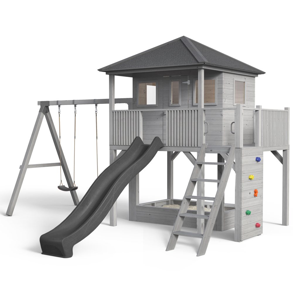 Legehuset giver rigtig god stabilitet takket være stærke 9 x 9 cm stolper. En sikker stige fører fra den ene side til altanen, og en klatrevæg med farverige sten på den anden side.