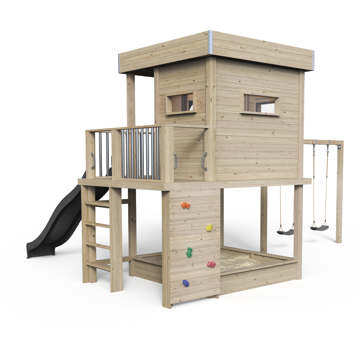 | Model | Stilt House Karl - Play World 850, gynge, rutsjebane, klatrevæg - uden maling / grå |