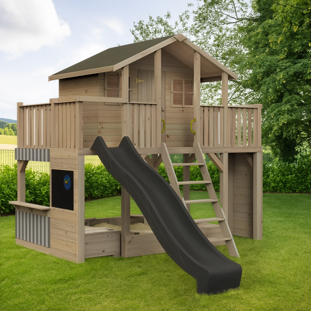 Loft er navnet på det største pælehus Tobi i sortimentet. Den er udstyret med en dobbelt balkon, hver med en klatrevæg og en massiv stige . Så der er god plads til mange børn, der inviterer venner til at putte, lege og sove i det lyse, ubehandlede interiør. Der er også en masse valgfrit tilbehør og en rutsjebane .