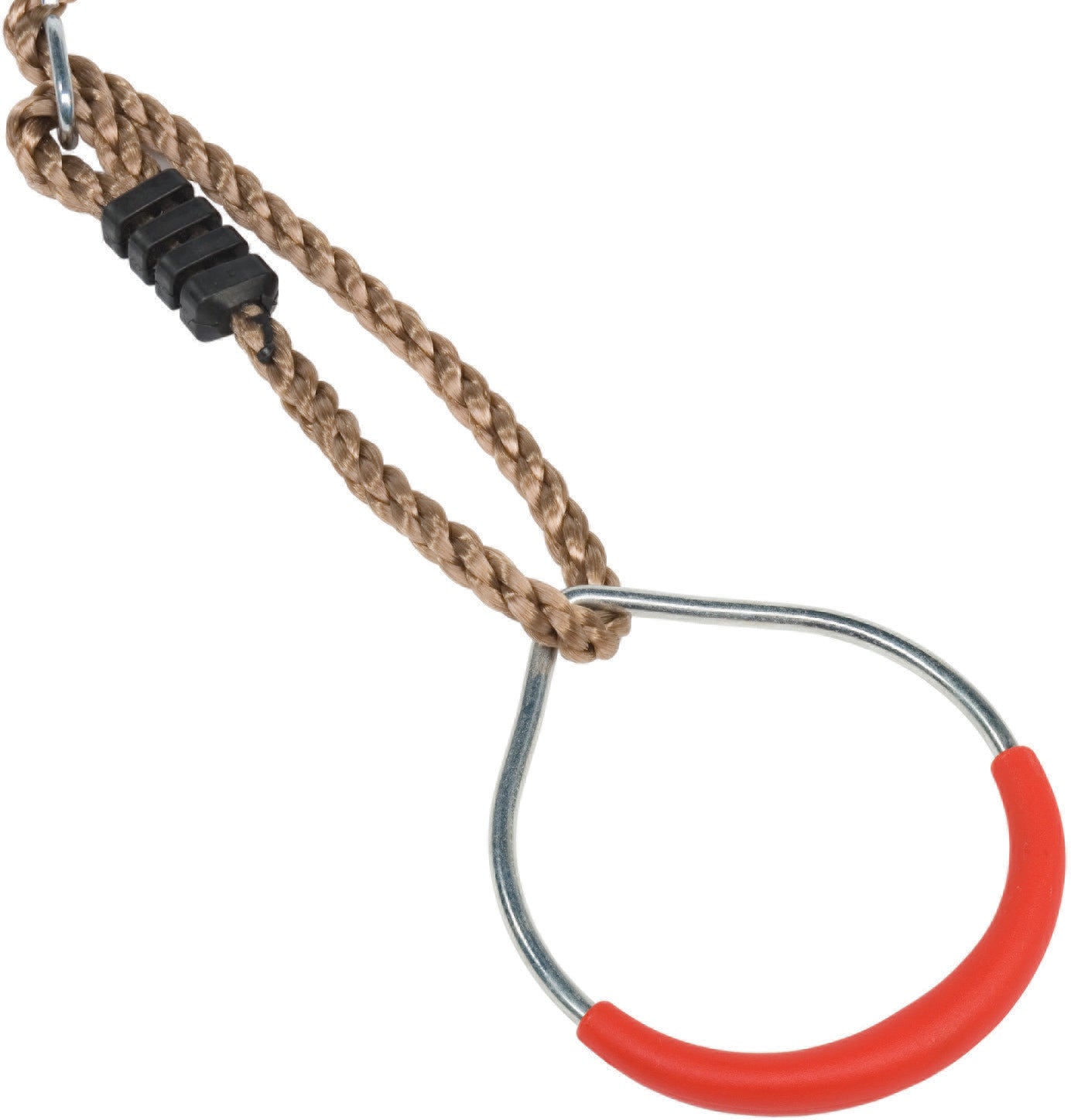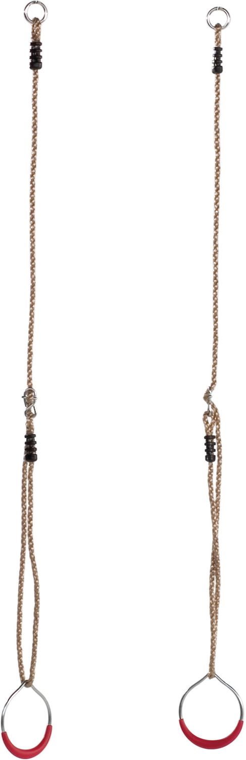 Med disse to gymnastikringe kan dine børn svinge sig ind i rebene og vise eller prøve deres gymnastikfærdigheder. Gymnastikringene er lavet af metal og beklædt med røde plastikhåndtag. De leveres sammen med de vejrbestandige PH-reb og kan nemt hænges i dine gyngeklemmer.